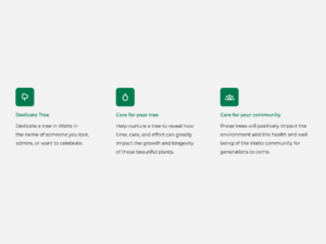 The platform supports efforts to increase green space in Watts while giving residents a meaningful way to participate. Each tree planted contributes to both environmental improvement and the creation of lasting community connections.